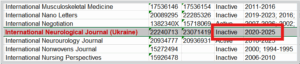 Зверніть увагу на колонку Active / Inactive, яка відображає поточний статус журналу в базі Scopus. Позначка Active означає, що видання наразі індексується і його нові випуски додаються до бази. Статус Inactive свідчить про припинення індексації – нові матеріали більше не включаються, а покриття обмежується зазначеним у колонці “Coverage” періодом. Наприклад: