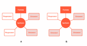 Якщо заклад вищої освіти чи наукова установа не може призначити двох рецензентів, склад ради може бути змінений і включати трьох офіційних опонентів та одного рецензента (рис. Б).